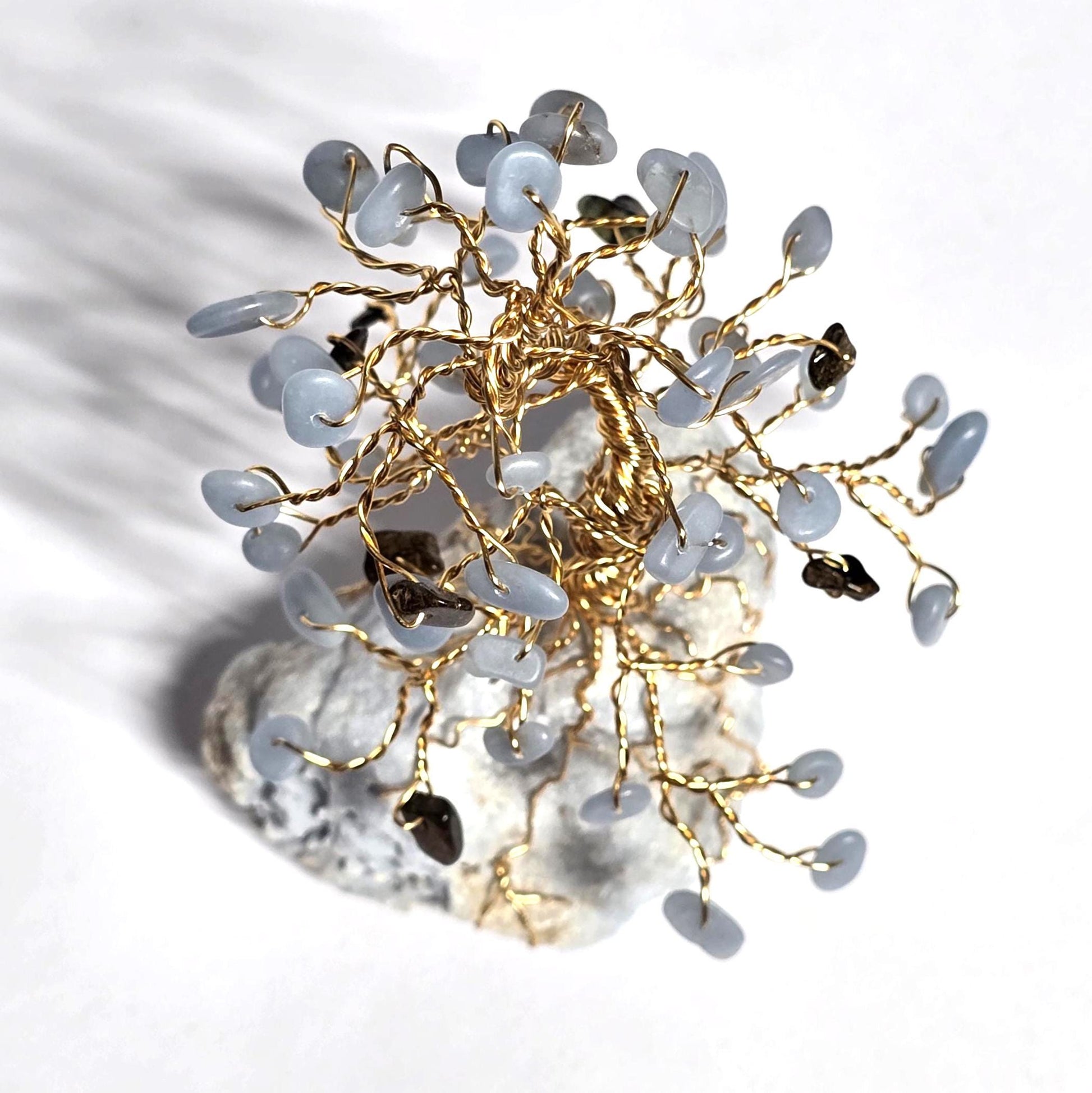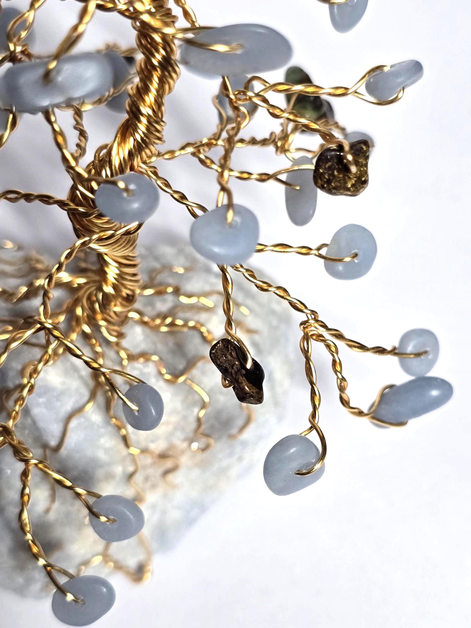 This handcrafted gem tree is made of genuine blue Angelite & brown Bronzite. The tree is mounted on a raw rough Angelite rock base, and the branches are made of gold wire. This unique art decor piece would make a wonderful gift for a special occasion.