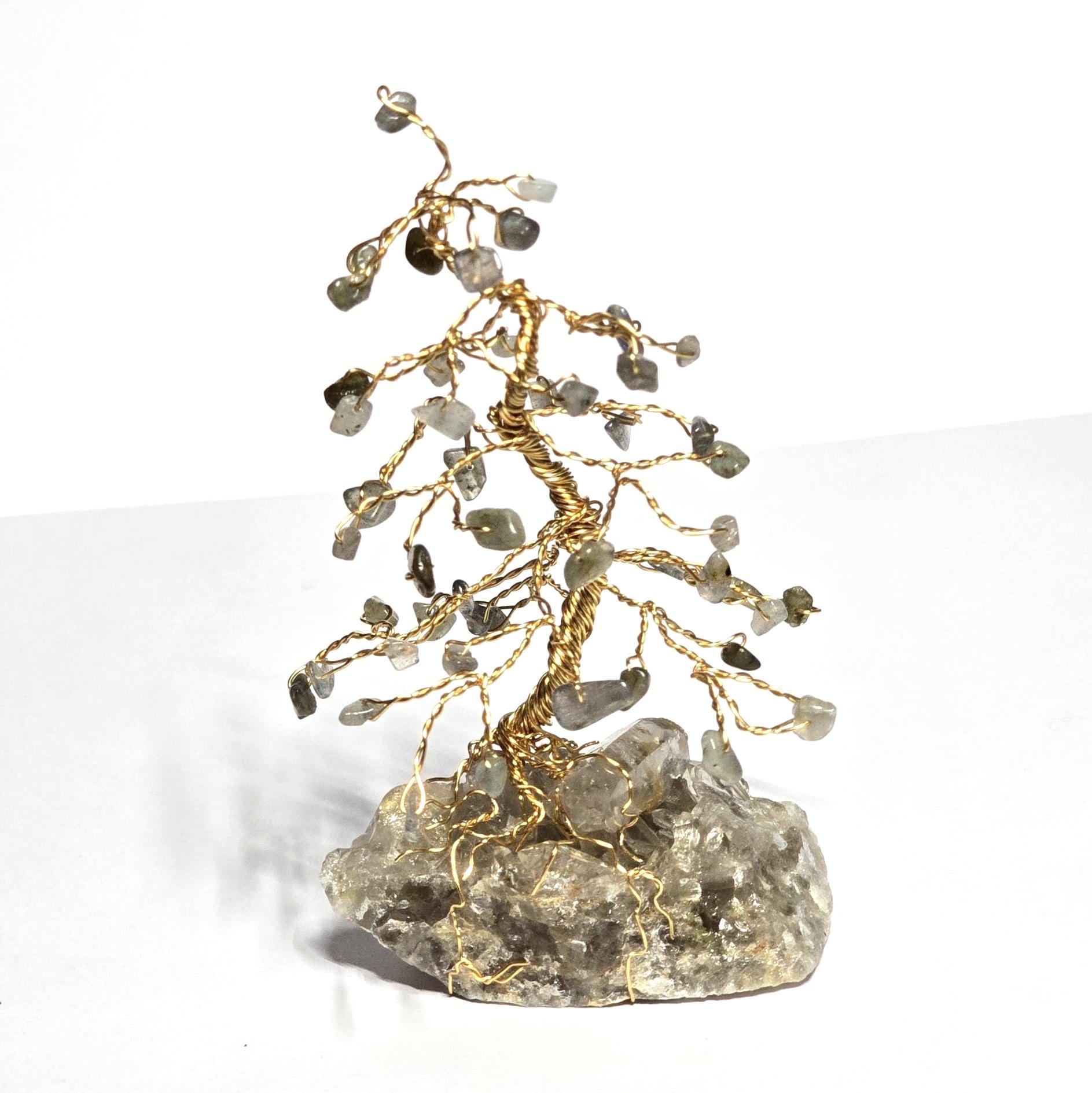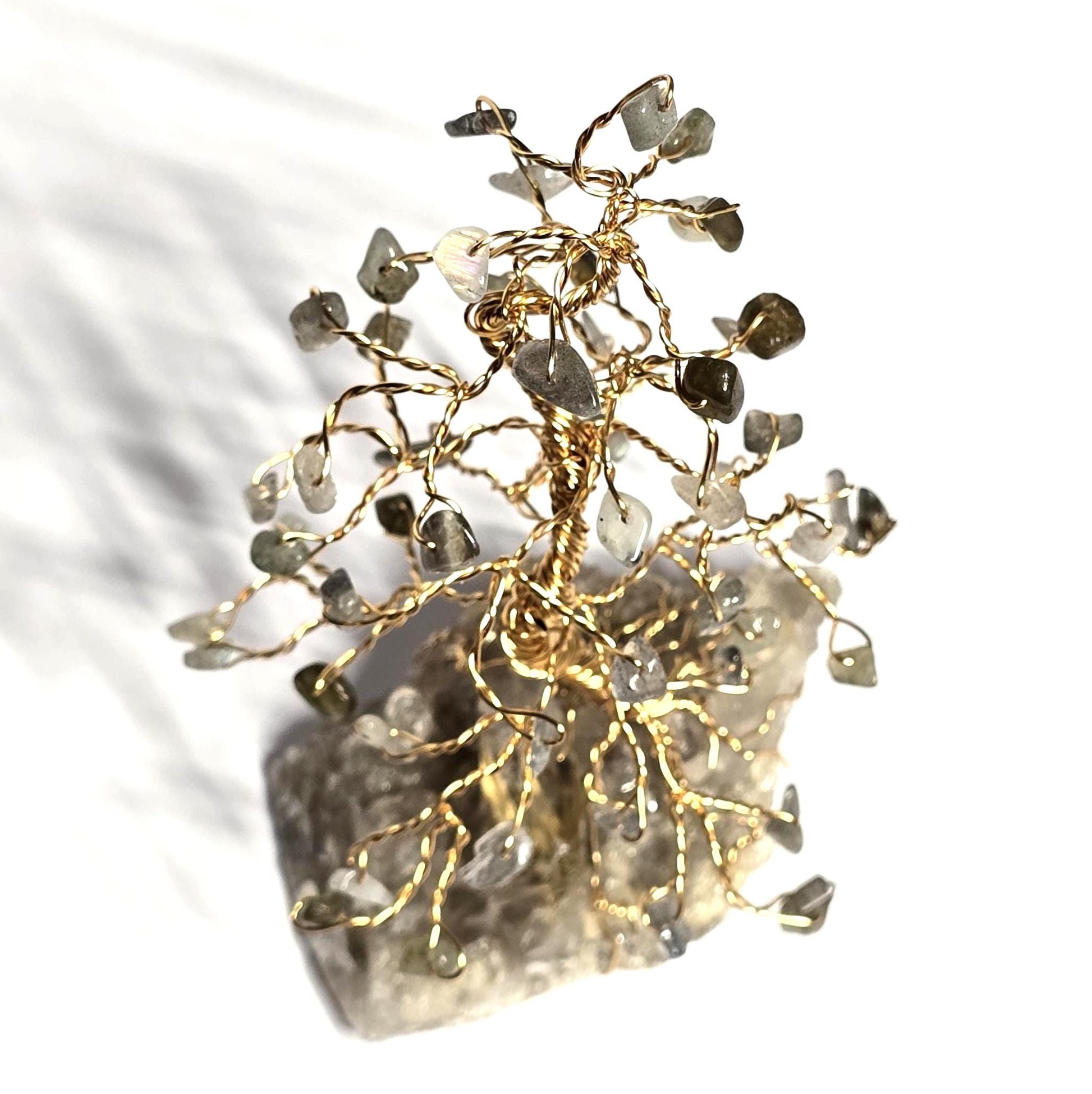 This handcrafted gem tree is made of genuine Labradorite. The tree is mounted on a unique Quartz rock base (with a gorgeous yellow rutilated quartz point), and the branches are made of gold wire. This unique art decor piece would make a wonderful gift for a special occasion.