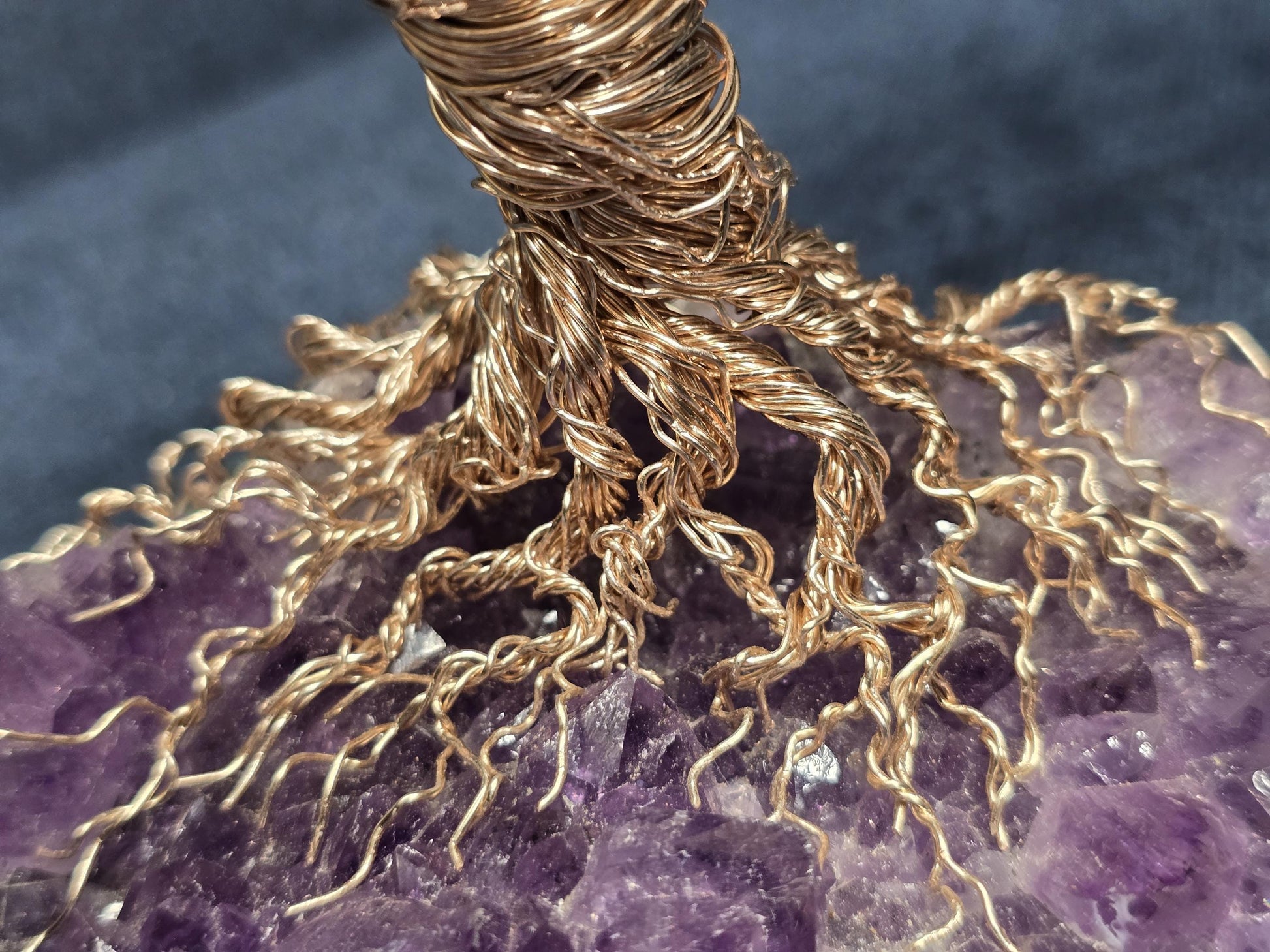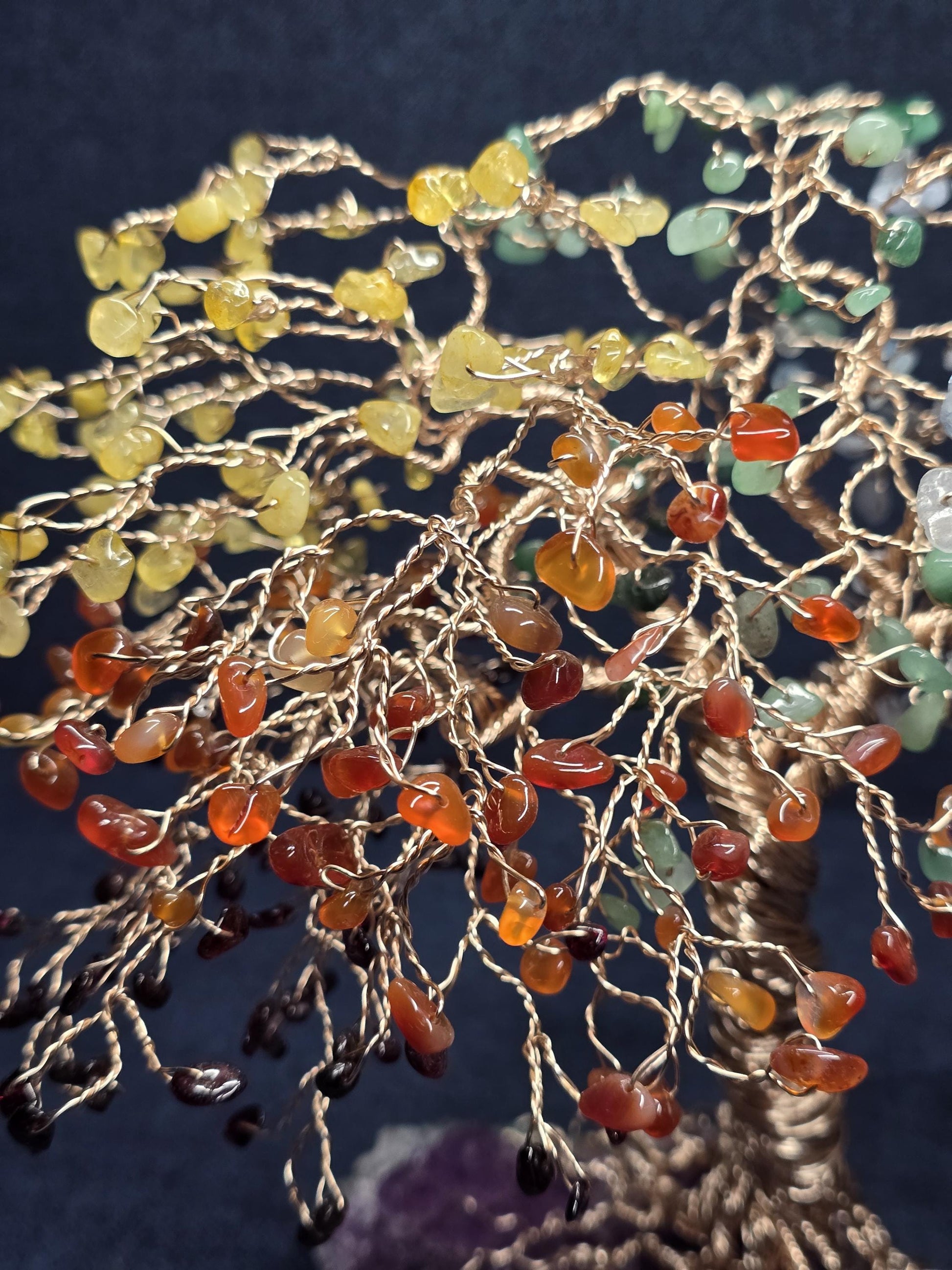 Overflowing with Energy. Crafted with Intention. Made to Transform a Space. This handmade chakra crystal tree is a radiant centerpiece of spiritual power and artistic beauty. Standing 11 inches tall and 12 inches wide, it features hundreds of carefully placed gemstones representing all 7 chakras — each wire-wrapped branch shaped by hand with loving craftsmanship. Rooted in an expensive, dark purple Amethyst cluster with brilliant flash, the tree glows with rich color, grounded wisdom, and high vibrational energy. The flowing gold wire amplifies abundance, light, and confidence, making this tree a bold symbol of inner alignment and outer elegance.