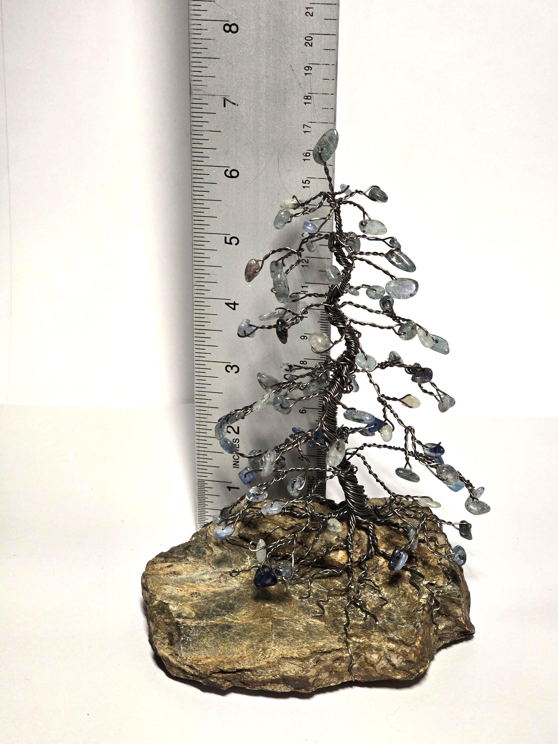 This handcrafted gem tree is made of genuine blue Kyanite. The tree is mounted on a special Black Hills rock base, and the branches are made of grey wire. This unique art decor piece would make a wonderful gift for a special occasion.