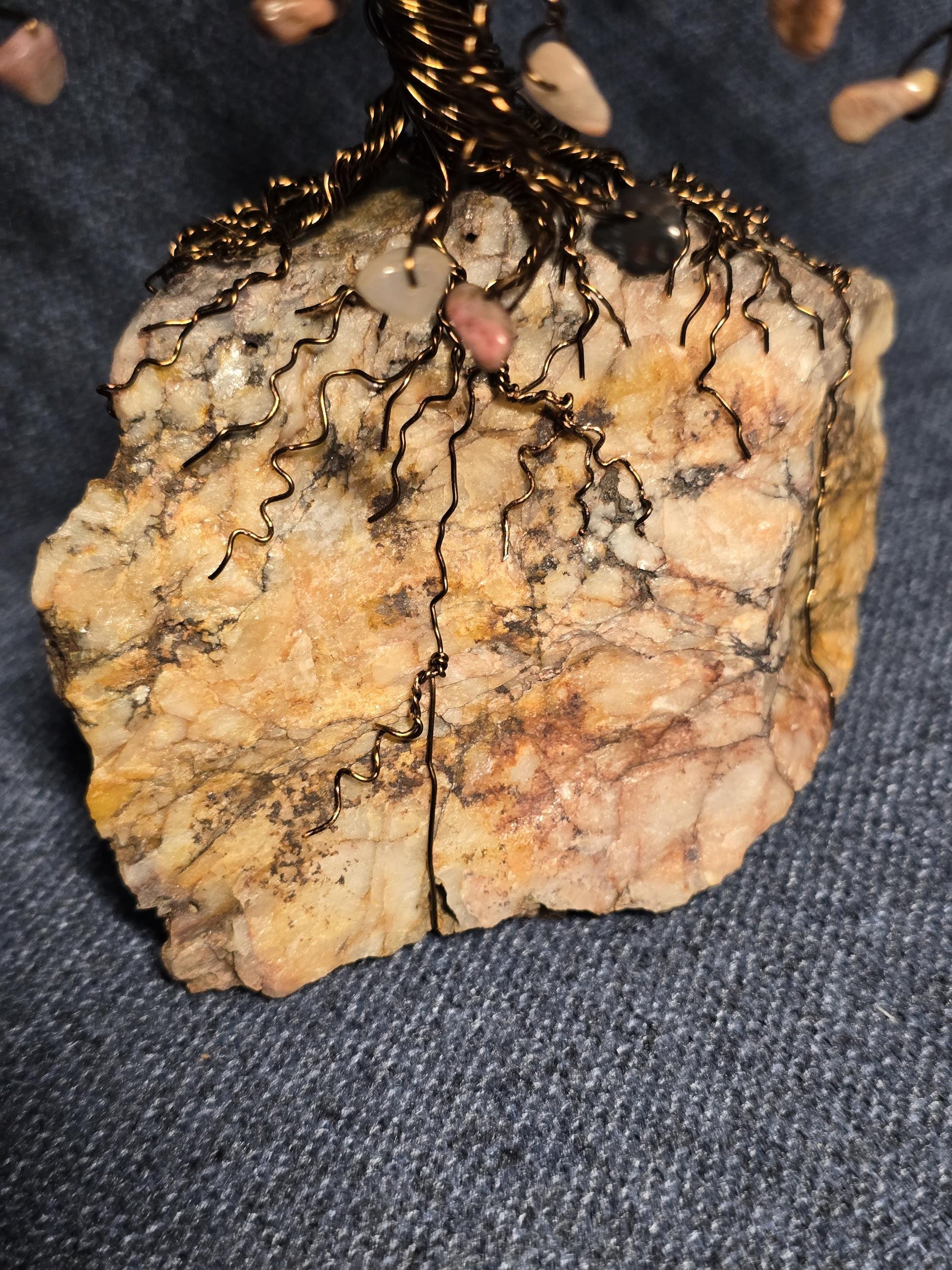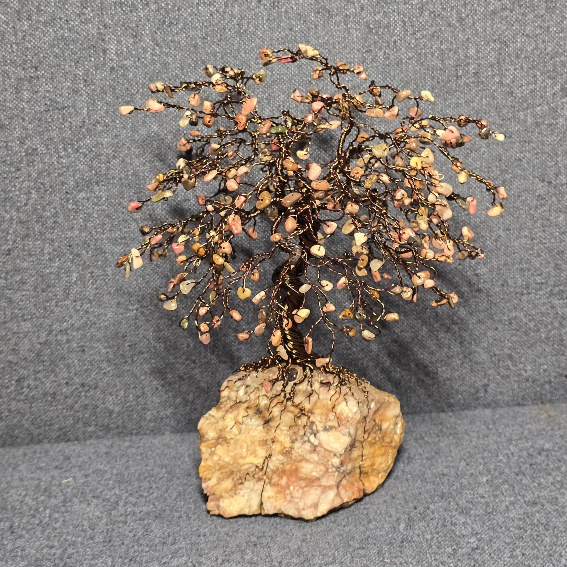 This handcrafted gem tree is made of genuine natural Rhodonite. The tree is mounted on a natural Black Hills rock base, and the branches are made of dark bronze wire. This unique art decor piece would make a wonderful gift for a special occasion.