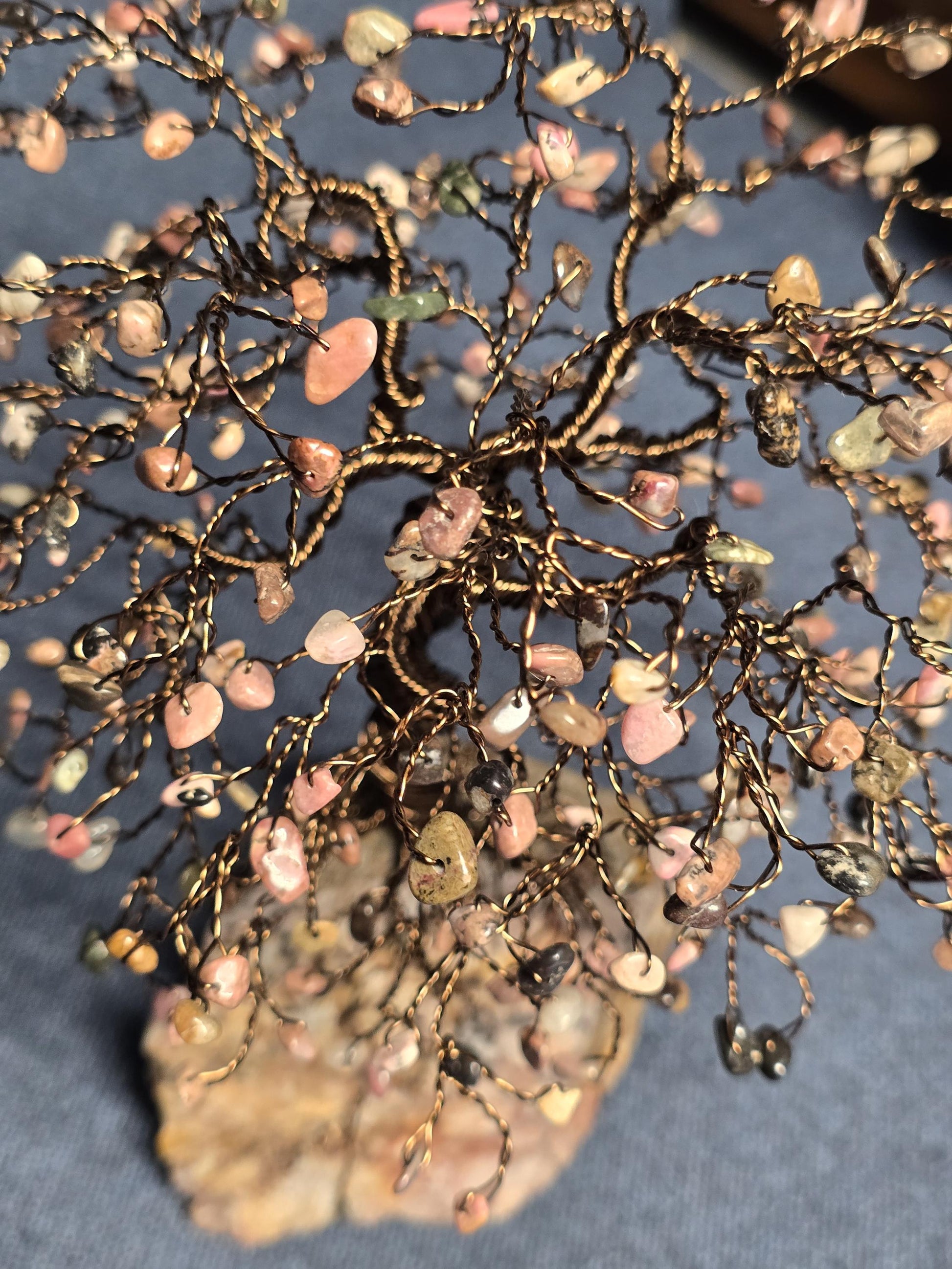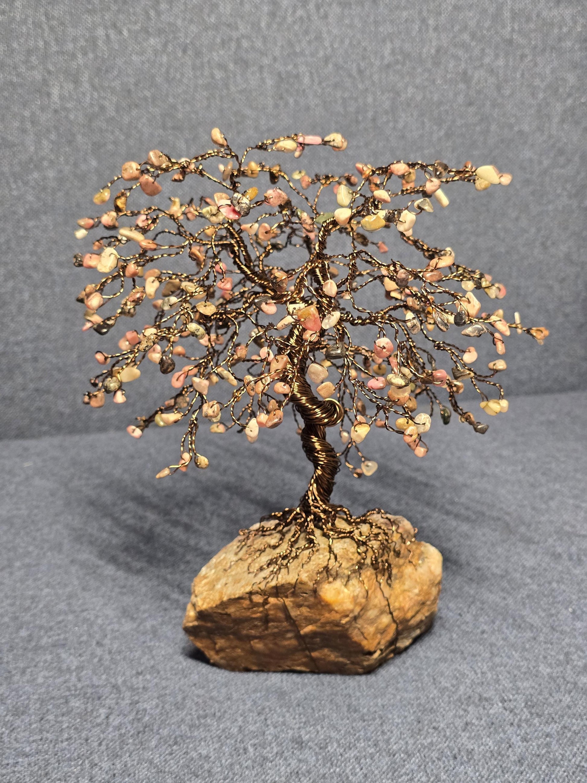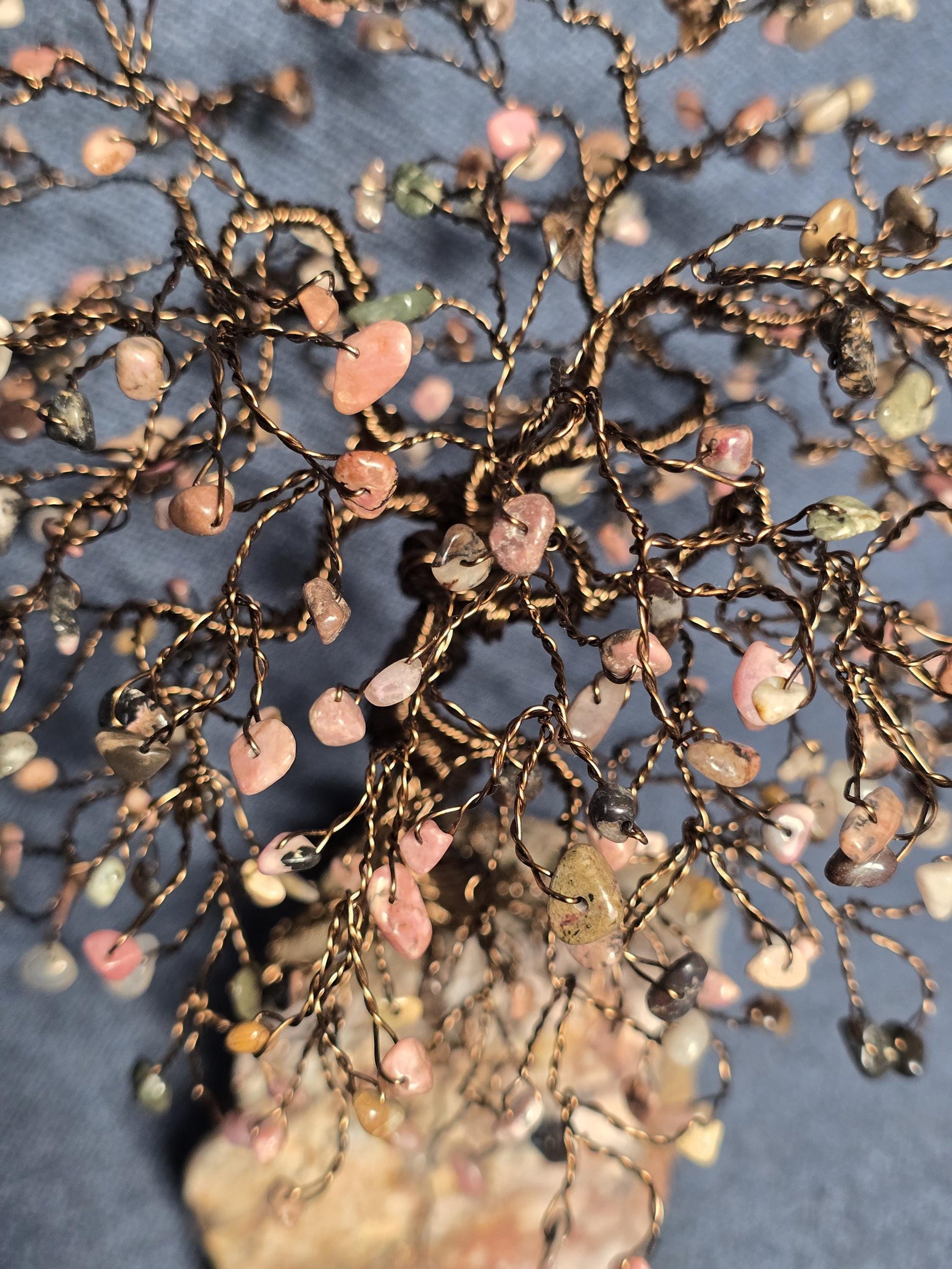 Large Rhodonite Gem Tree with Dark Bronze Wire, Handcrafted Wire Sculpture Art
