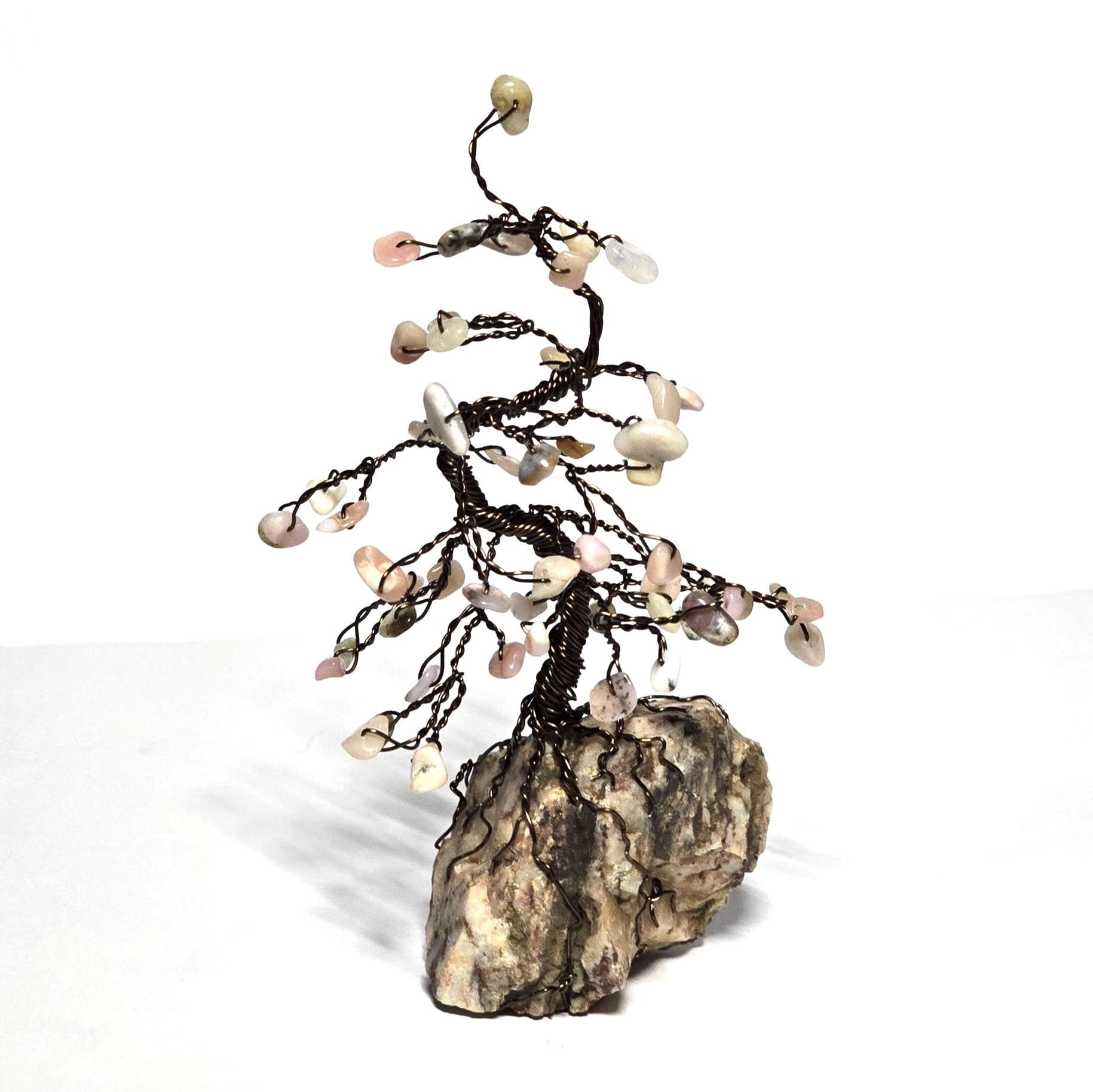 This handcrafted gem tree is made of genuine earthy pink Andean Opal. The tree is mounted on a special Black Hills rock base, and the branches are made of dark bronze wire. This unique art decor piece would make a wonderful gift for a special occasion.