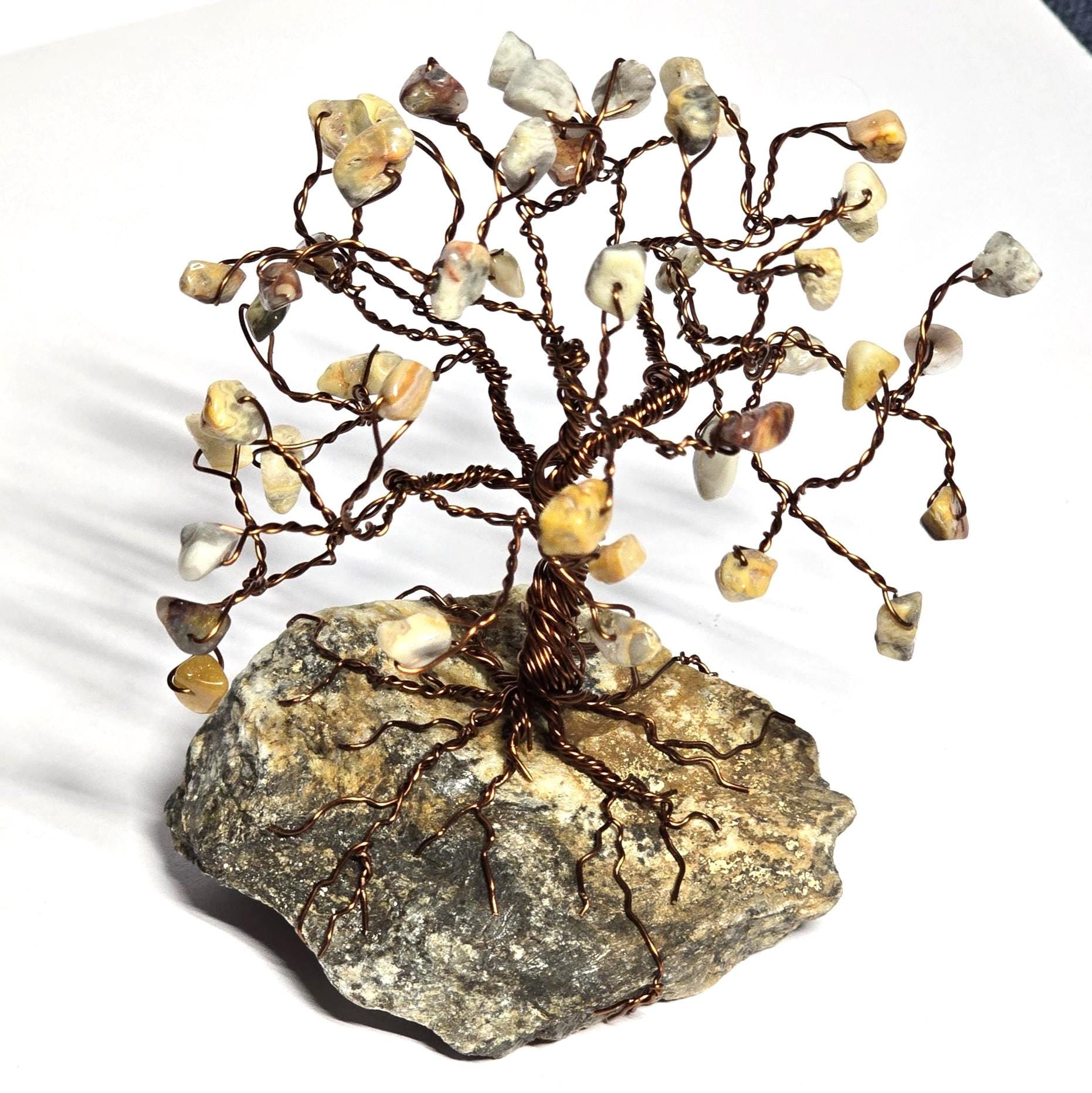 This handcrafted gem tree is made of genuine earth toned Crazy Lace Agate. The tree is mounted on a unique Black Hills rock base, and the branches are made of brown wire. This unique art decor piece would make a wonderful gift for a special occasion.
