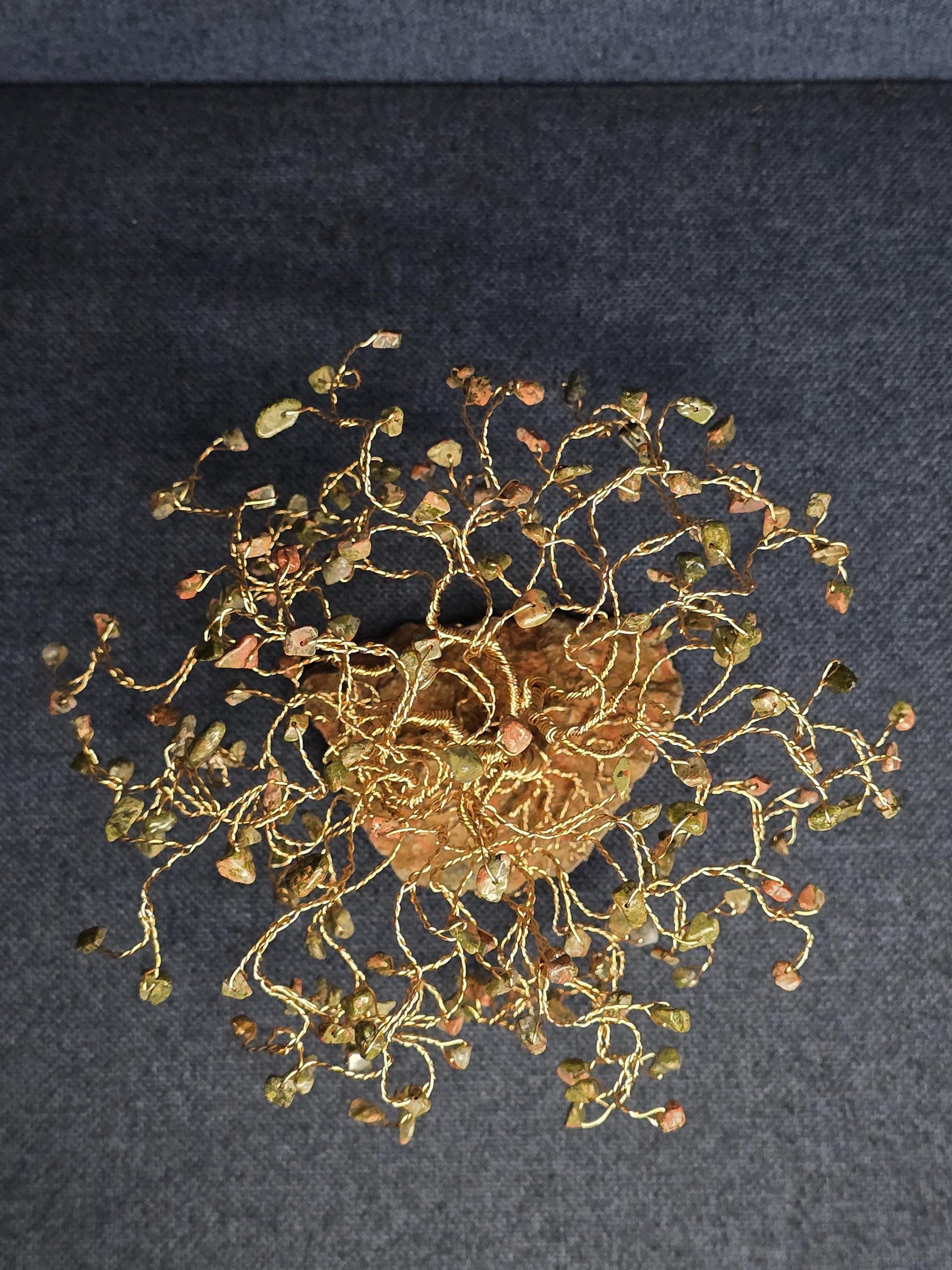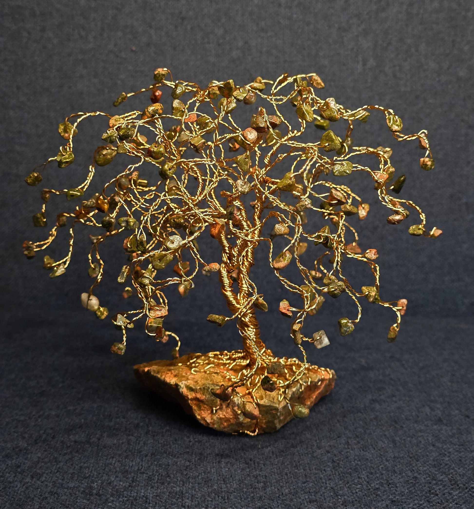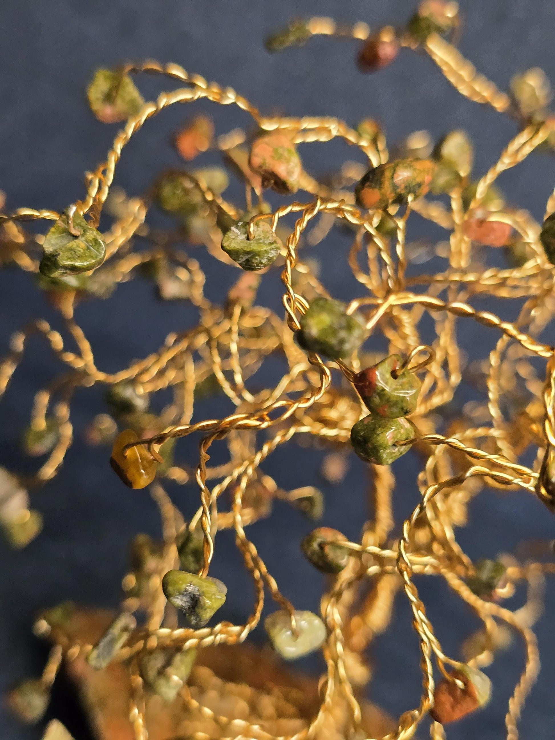 This handcrafted gem tree is made of genuine Unakite, which is a stone said to promote healing. The tree is mounted on a Unakite rock base, and the branches are made of rose gold wire.